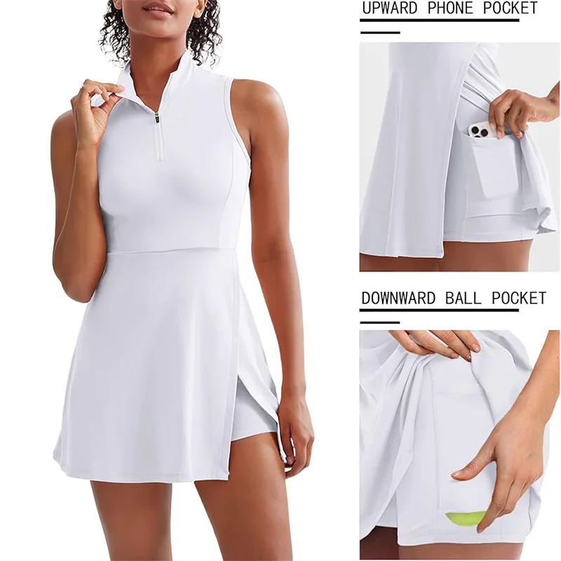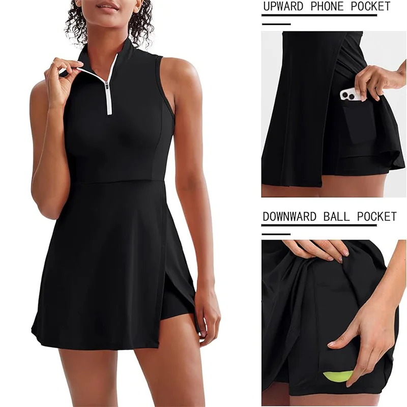 · 【THE NECK OF ZIaPPER STYLE DESIGN】 The exercise dress with built in shorts can be easily adjusted to your comfortable position. You don’t have to worry about embarrassing sweat stains anymore with this workout dress with built in shorts because its fabric technology wicks up sweat and other fluids.