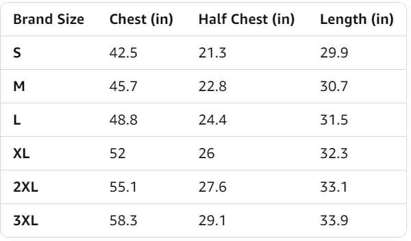 S, M, L, XL, 2XL, 3XL