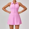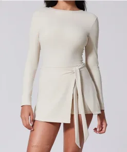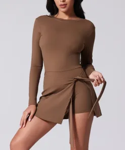 Fashion-forward and beyond functional, athletic dress for women festures with long sleeve, NO PADDED, High neck, sexy u back,Backless, self tie a mini-length s-line wrap skirt with bulit- shorts.